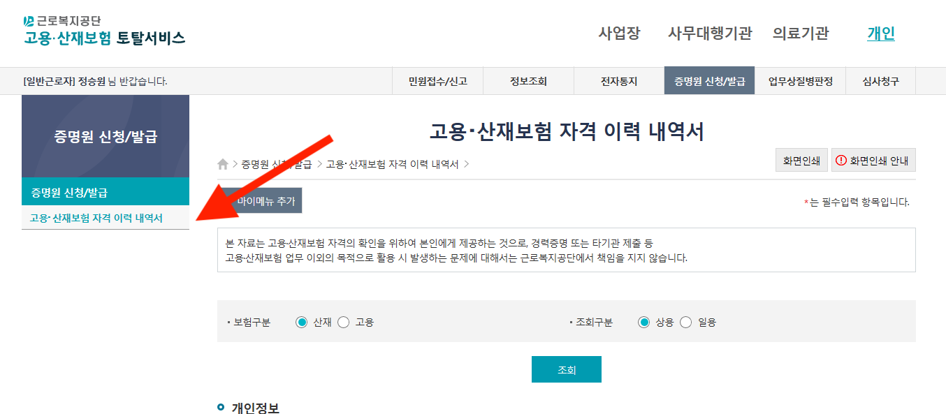 로그인후 증명원 신청/발급 탭에서 고용 산재보험 자격 이력 내역서 (화살표 참조) 클릭 후에 조회하면 그동안 가입되었던 모든 정보를 출력해준다