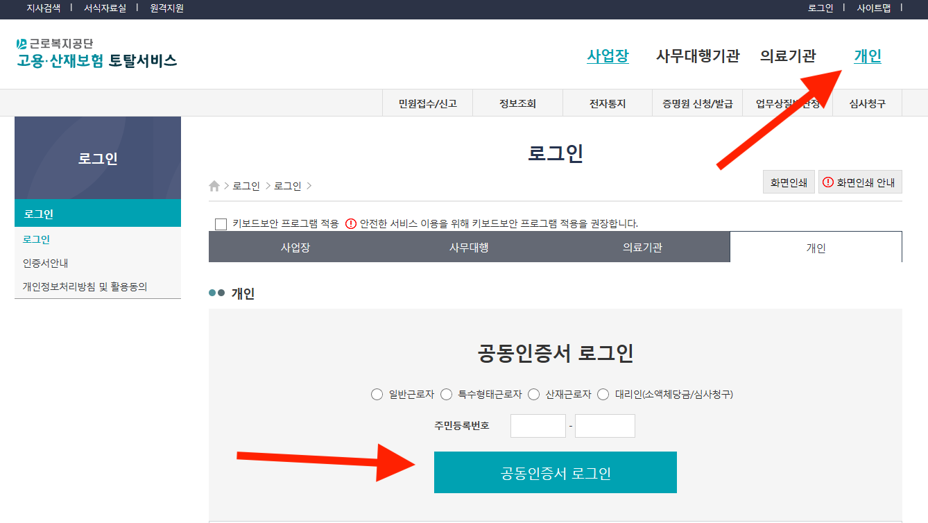 사이트 접속 후 우측 상단 개인을 클릭후에 공동인증서(공인인증서)로 별도의 회원가입없이 로그인이 가능하다